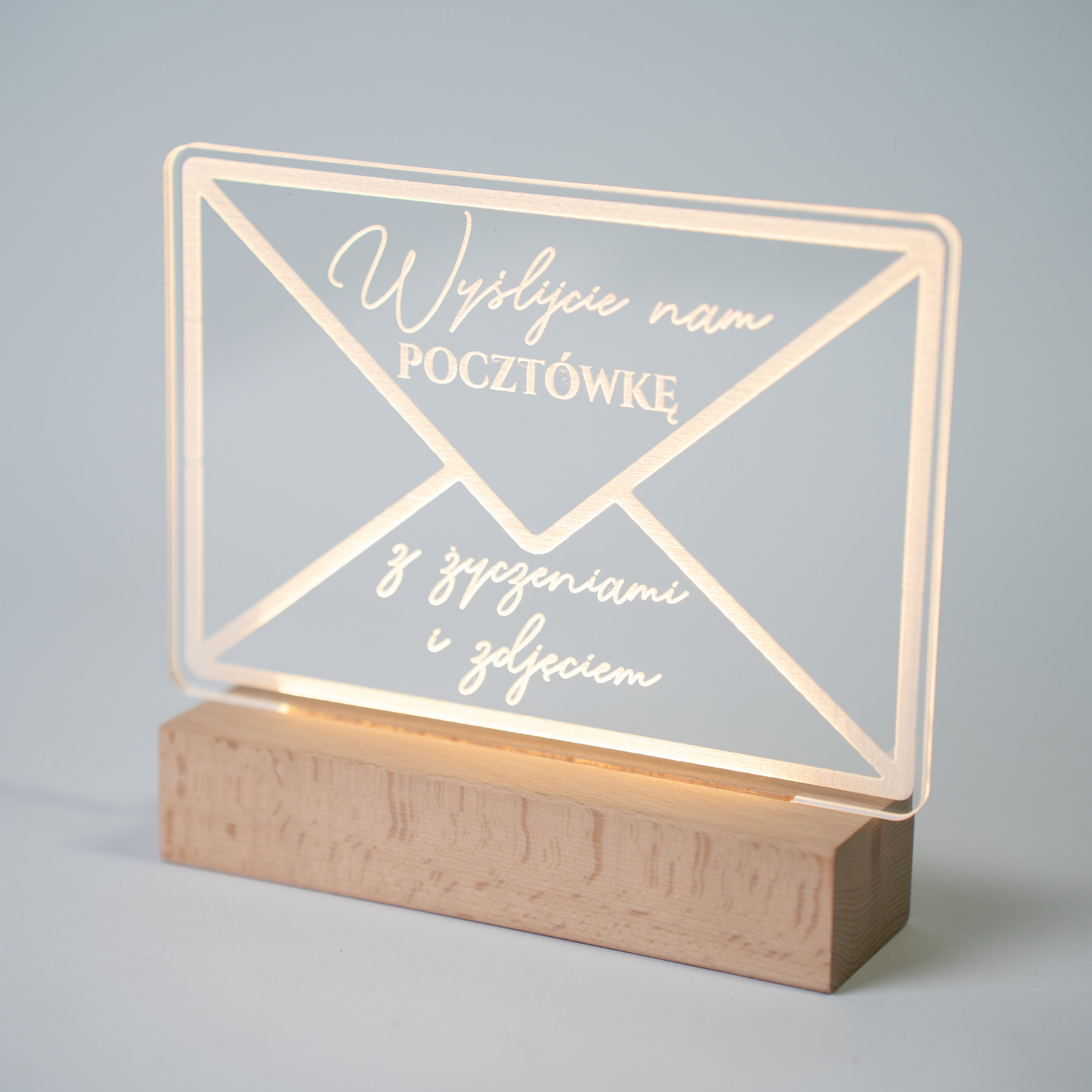 Subtelna i elegancka tabliczka akrylowa z napisem „Wyślijcie nam pocztówkę z życzeniami i zdjęciem” to piękny dodatek do strefy poczty weselnej. Pełni funkcję delikatnej instrukcji dla gości, zachęcając ich do pozostawienia miłych słów i wspomnień z wyjątkowego dnia.