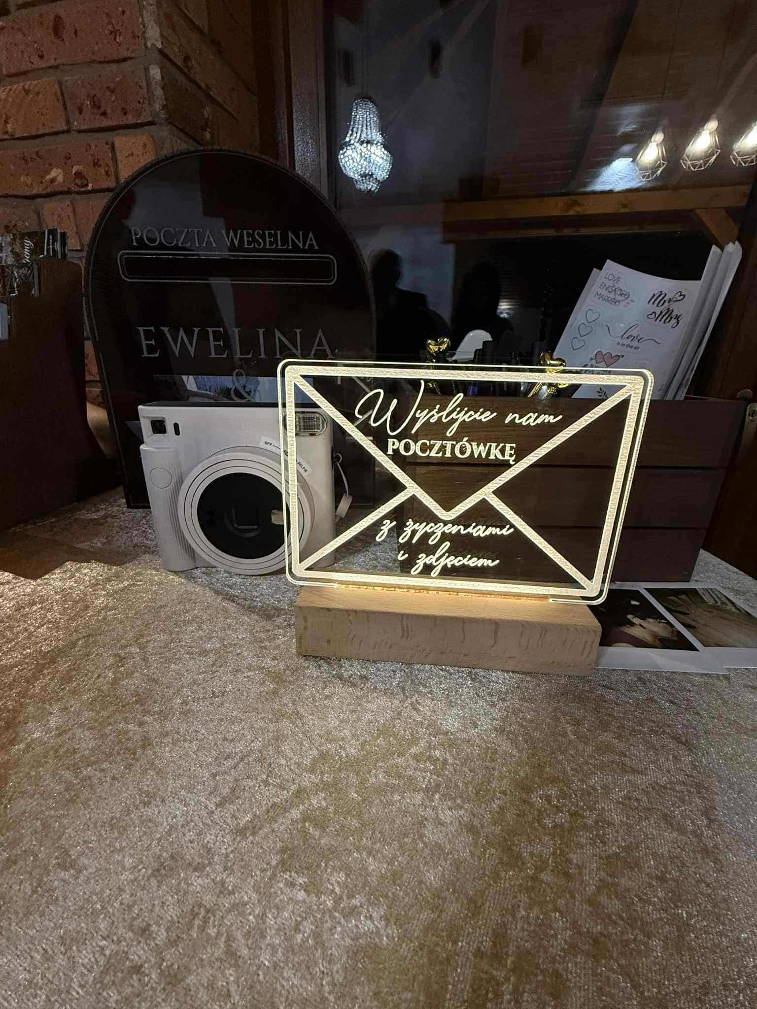Wykonana z przezroczystego akrylu z grawerowanym napisem i umieszczona w drewnianej podstawie, subtelnie podświetla się ciepłym światłem, tworząc romantyczny klimat na sali weselnej. Minimalistyczna forma sprawia, że znak idealnie komponuje się z każdą aranżacją — boho, rustykalną czy nowoczesną.
