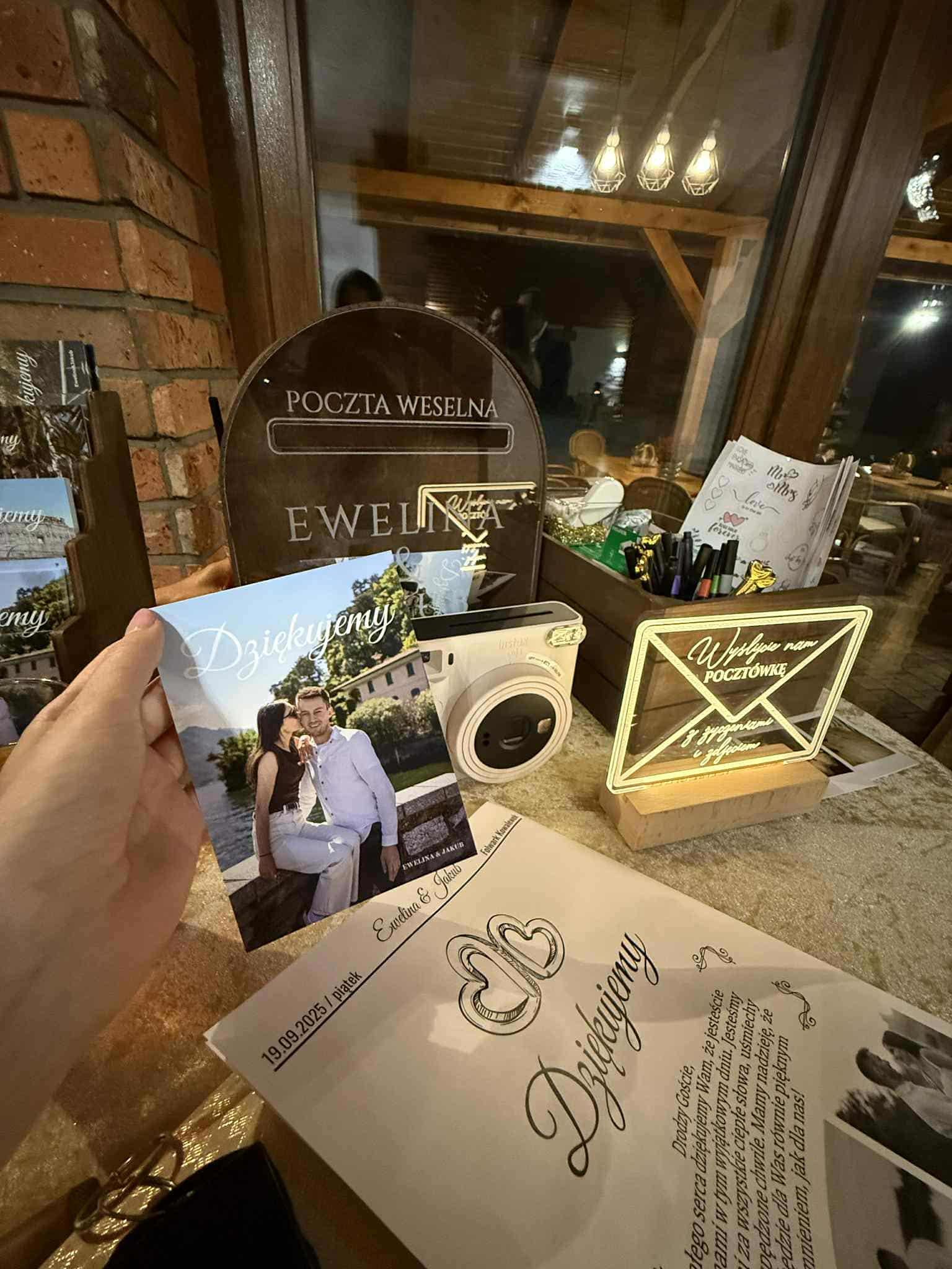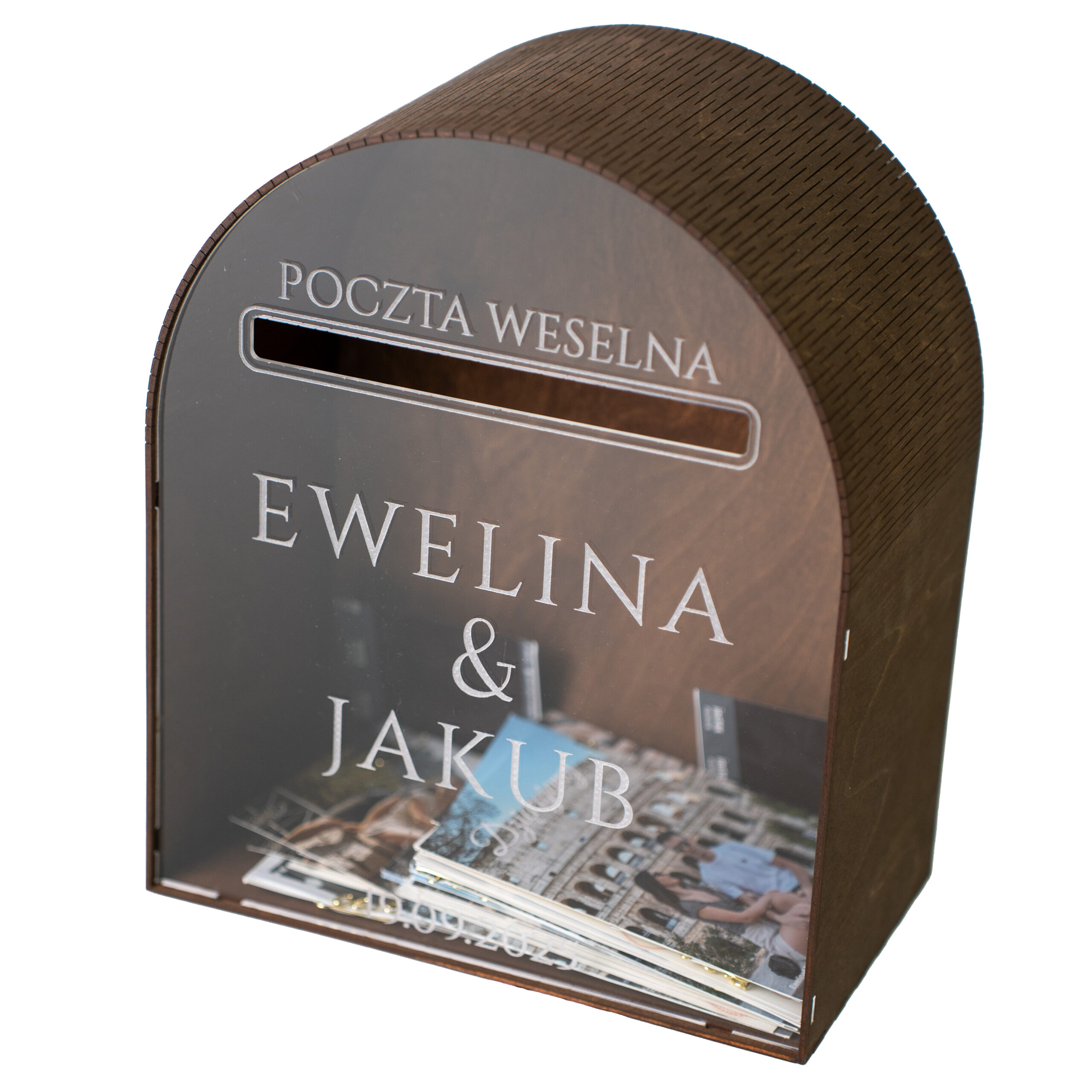 Na froncie znajduje się napis „Poczta Weselna” oraz personalizowany grawer z imionami Pary Młodej i datą ślubu. Dzięki temu skrzynka staje się niepowtarzalną pamiątką na długie lata.