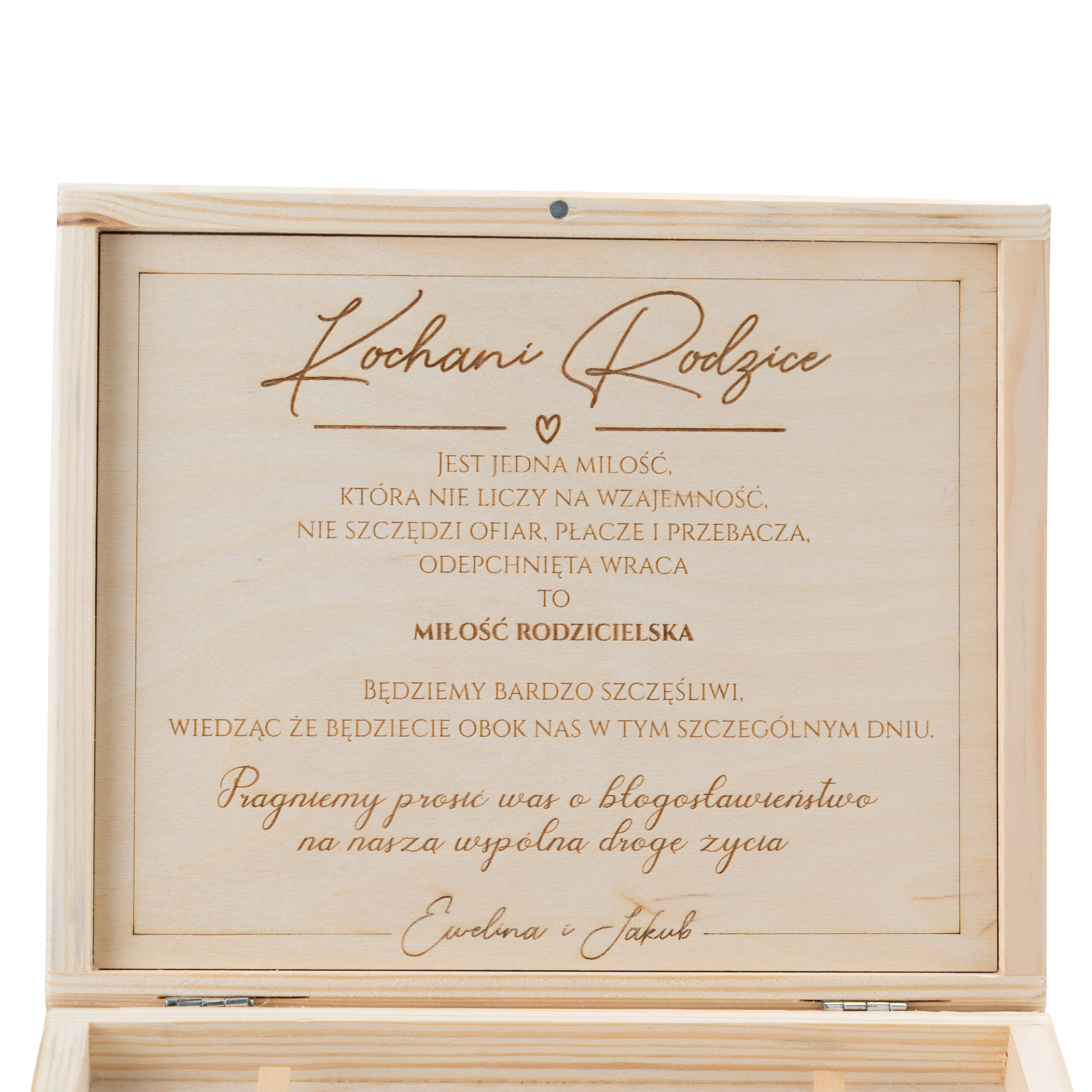 Wyjątkowy gest zasługuje na wyjątkową oprawę. Nasze drewniane pudełko z prośbą o błogosławieństwo to elegancki i ponadczasowy sposób, aby wręczyć rodzicom zaproszenie na wesele wraz z osobistym podziękowaniem.